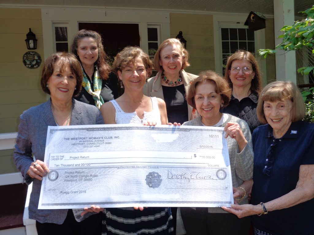 Today, at Westport's Project Return, the Westport Woman's Club's Ruegg Committee presented their 2016 Ruegg Grant, in the amount of $10,000, for use in repainting the group's facility, a historic house on North Compo Road.