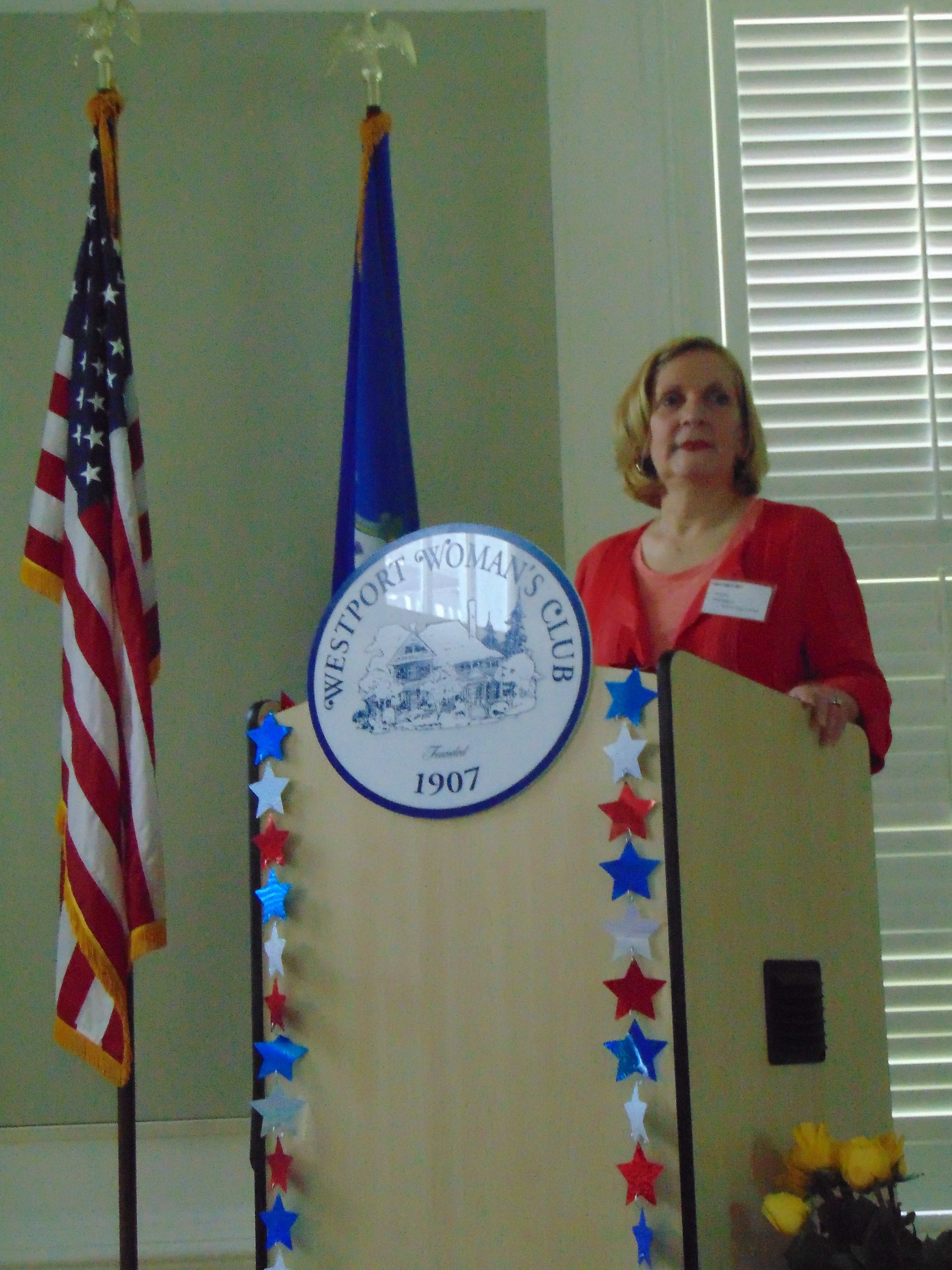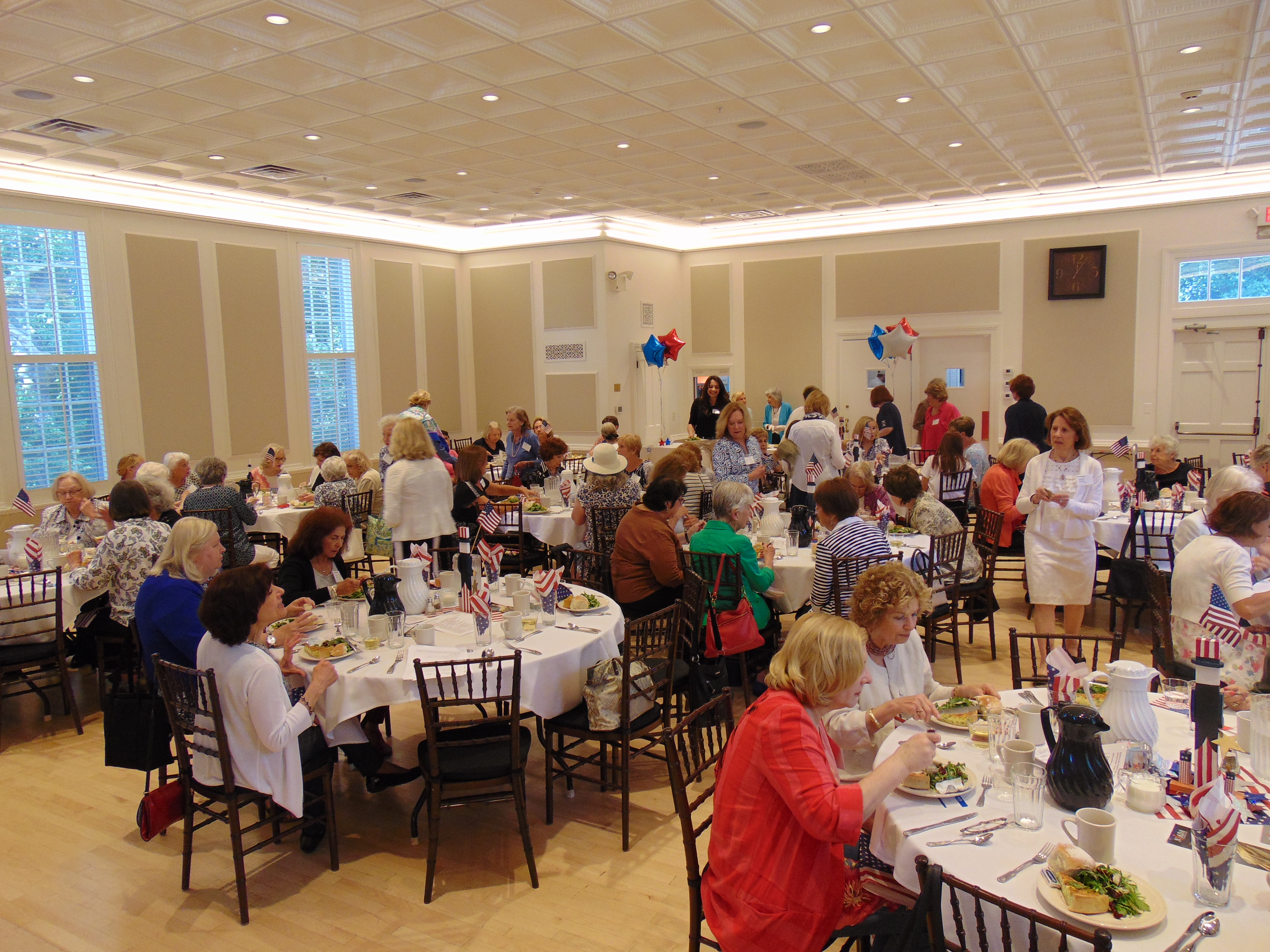 Bedford Hall was fittingly decorated in a red/white/blue patriotic theme for the club’s June luncheon, as the membership prepares for their largest WWC fundraiser of the year ~ the YANKEE DOODLE FAIR (June 13 – 16).